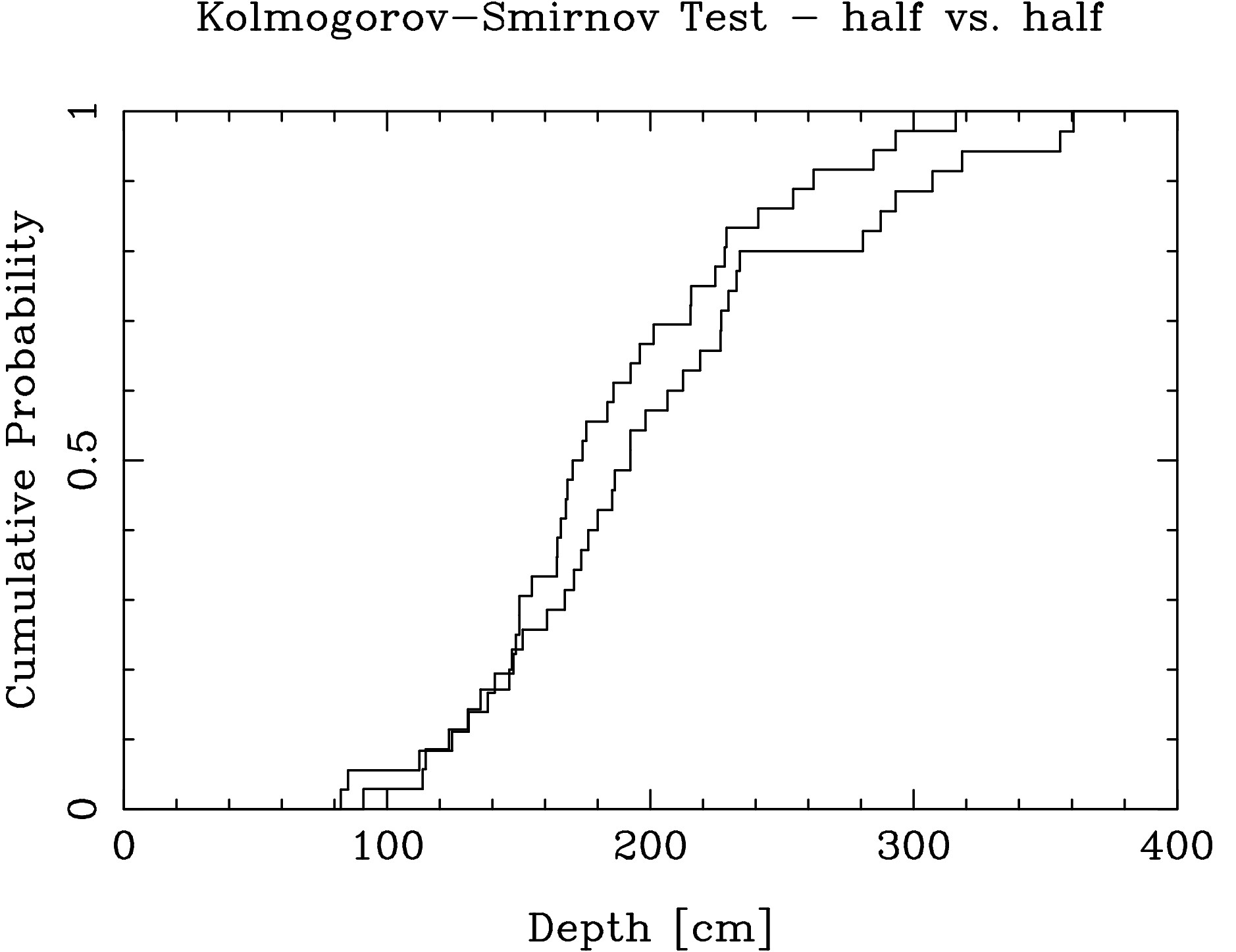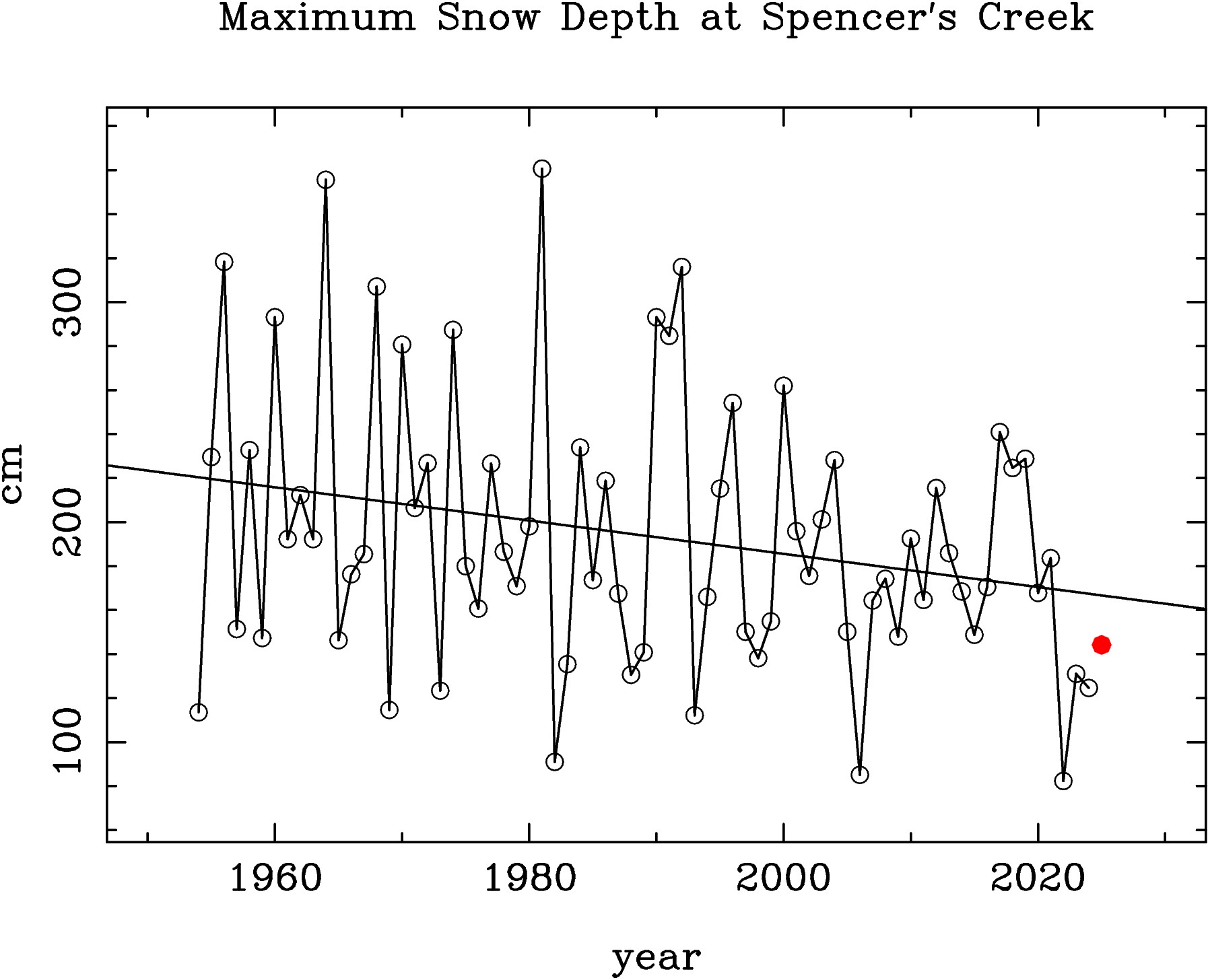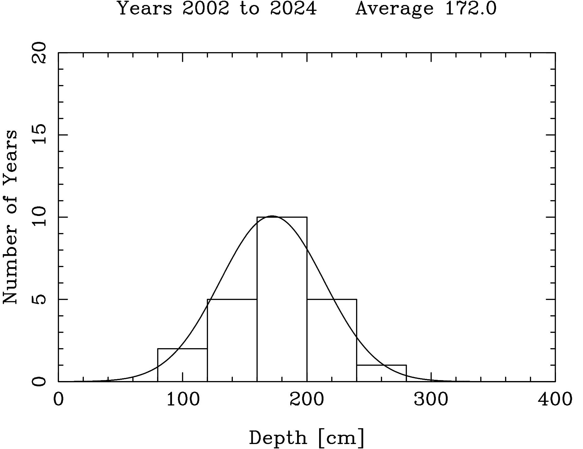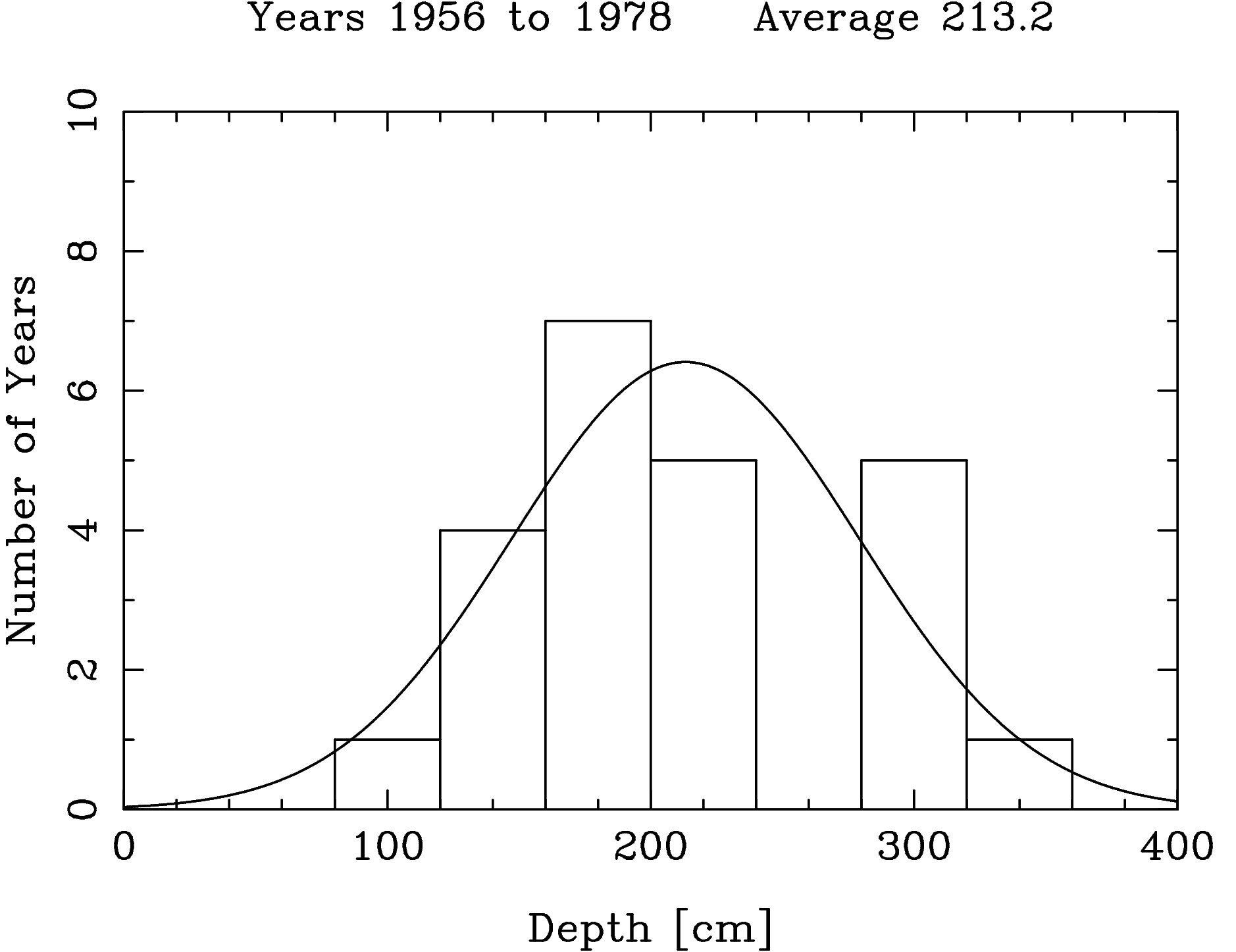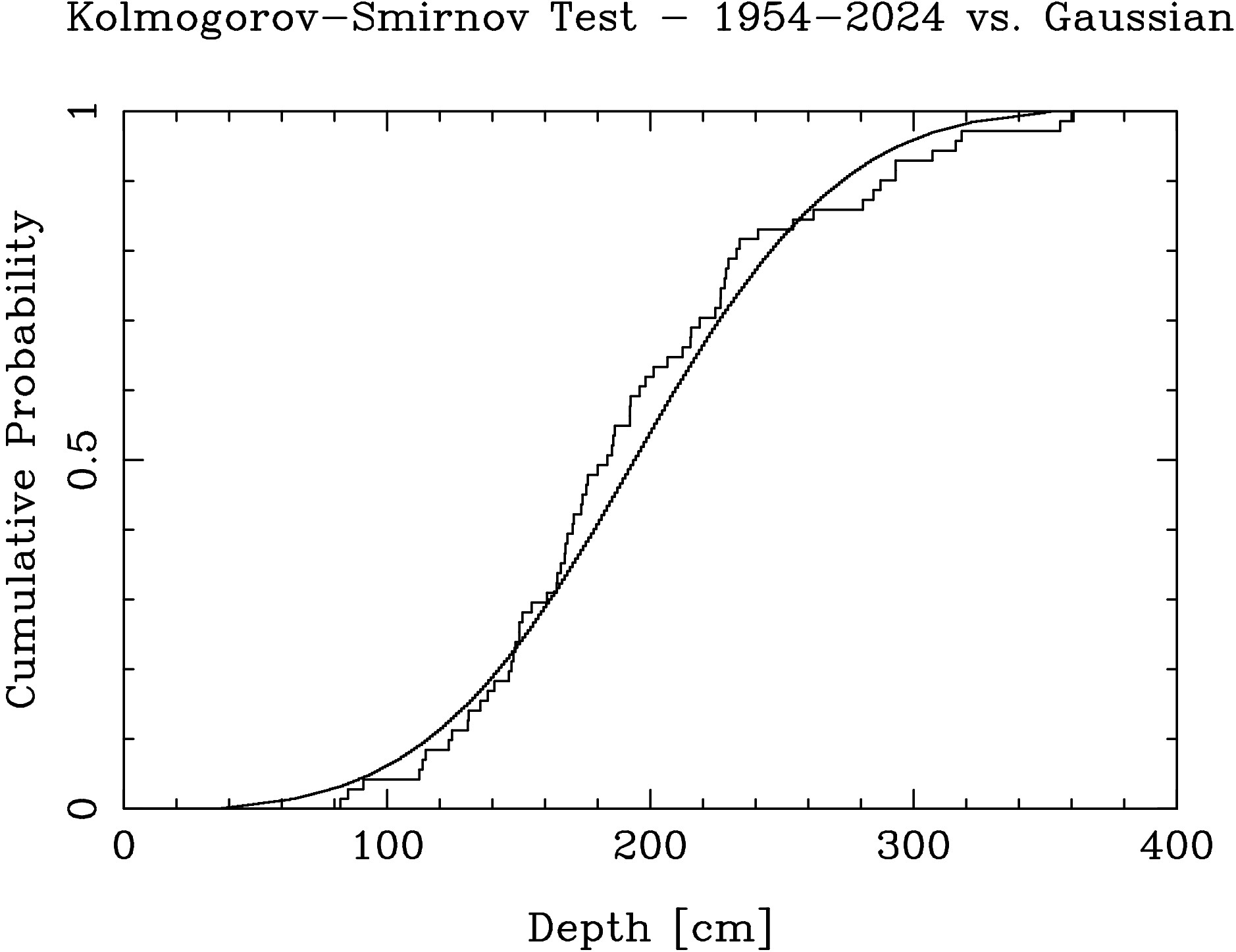 ![]() The result of this second Kolmogorov-Smirnov Test is that there is a 52% probability that the snow depth distribution from 1955-1989 comes from the same underlying distribution as the snow depth distribution from 1990-2024. The snow depth of the last 10 years has an average of 170.3 cm and a variance of 48.4 cm, as compared to the snow depth of the past 23 years, given in the table Snow Depth Trends, which has an average of 172.0 cm and a variance of 41.9 cm. I expect that snow depth for 2025 will not be much different than the average of the last 10 years, 170.3 cm, and perhaps only slightly lower than the linear trend, and higher than last year. |