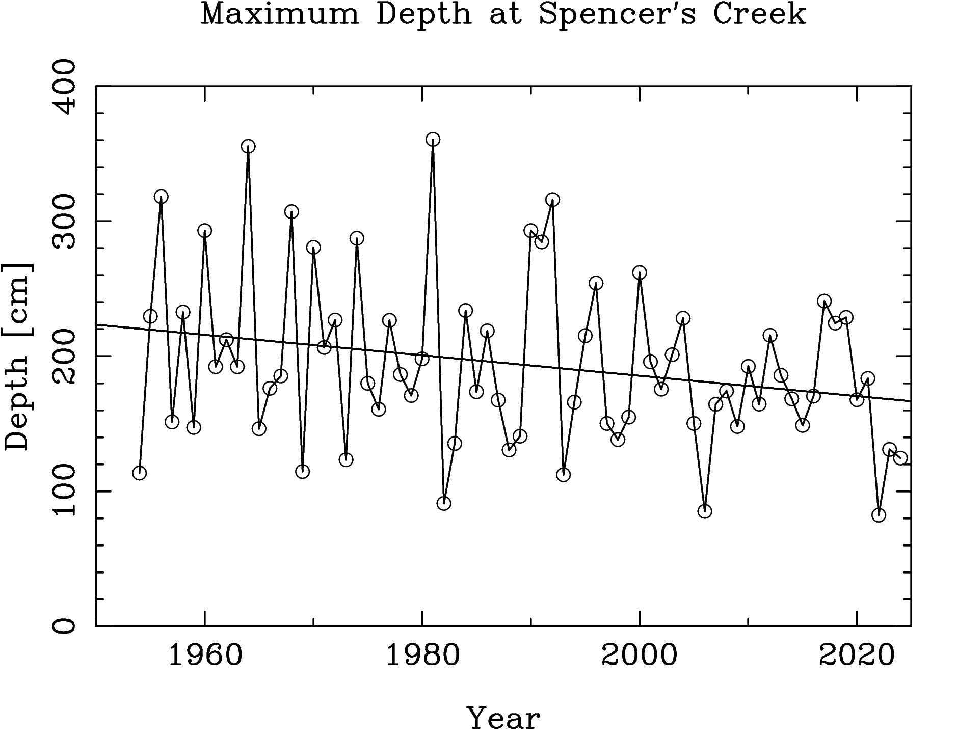 3 meters. Fewer years had maximum snow depths above 3 meters in the