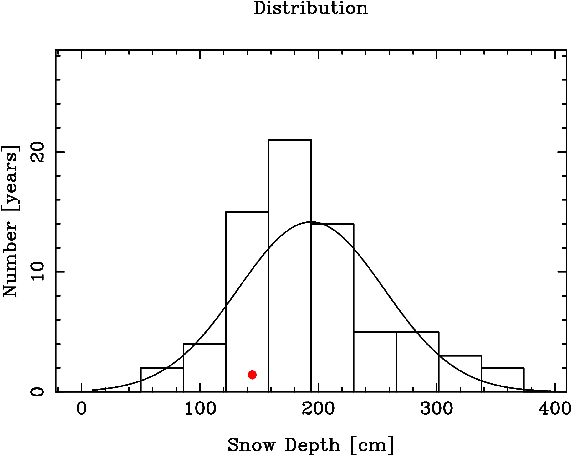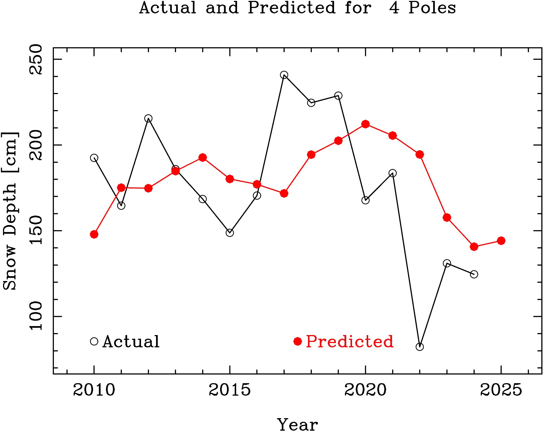![]() As can be seen in Figure 2, years with below average snow depths occur more often than expected from purely random variations, as do exceptional years with depths exceeding the average by more than 100 cm. The prediction for 2025, based on the measurements from 1954 through 2024, is for a maximum snow depth of 144.2 cm, which is 49.7 cm less than the 71 year average of 193.9 cm, 22.5 cm less than the 166.7 cm expected from the decreasing linear trend, and 19.6 cm above the actual 124.6 cm in 2024. We can expect the 2025 snow depth to be below the long term average, slightly below the liner trend, and slightly better than last year. I computed the maximum entropy and linear prediction values made with a varying number of poles, and found that the minimum of root-mean-square differences between the predicted and actual values was obtained using only 4 or 5 poles.